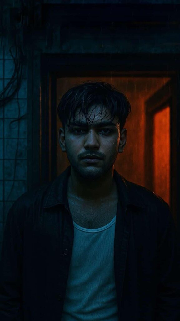 - Convert this photo into a cinematic portrait of a young man standing in a doorway at night. Apply dramatic colored lighting: blue from the front and warm orange behind him n the room. The setting should look slightly gritty or vintage, like an old apartment with tile walls and visible wires. Add soft shadows, rain or misty atmosphere, and a film grain texture for a moody, neo-noir feel. Wet hair, white tank top, and an open dark jacket. Make the image highly detailed, realistic, and color-graded like a movie still.
