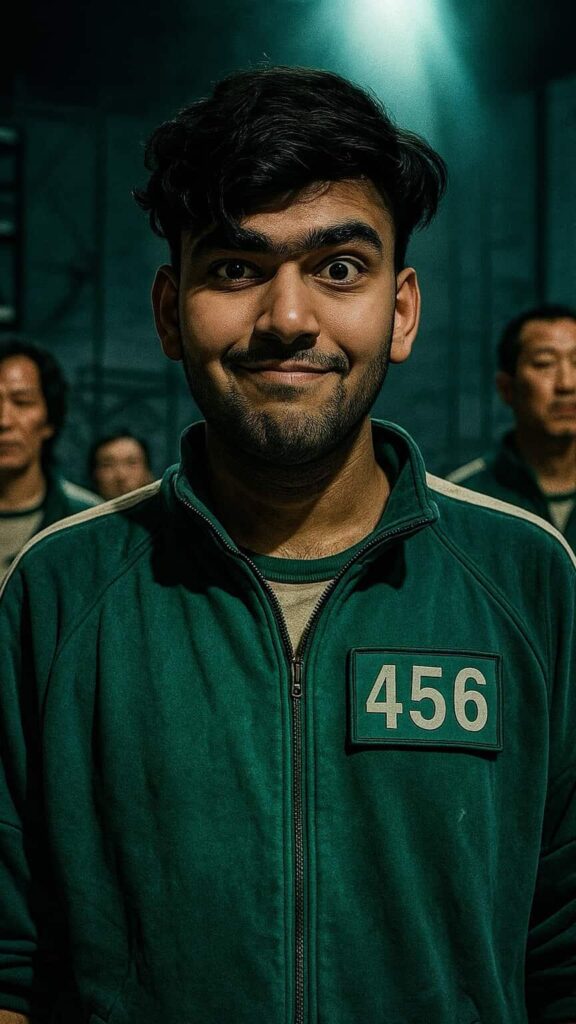 - TRANSFORM THIS PERSONIN THE PHOTO INTO A SCENE FROM THE SQUID GAME TV SERIES. KEEP THE FACE EXACTLY THE SAME. ADD A GREEN TRACKSUIT WITH A WHITE NUMBER TAG, DIM INDOOR LIGHTING WITH A DRAMATIC AND TENSE ATMOSPHERE, AND BACKGROUND CHARACTERS IN SIMILAR OUTFITS. MAKE IT LOOK LIKE A CINEMATIC SHOT FROM A SURVIVAL GAME SHOW, KEEPING FACIAL EXPRESSION AND IDENTITY UNCHANGED.