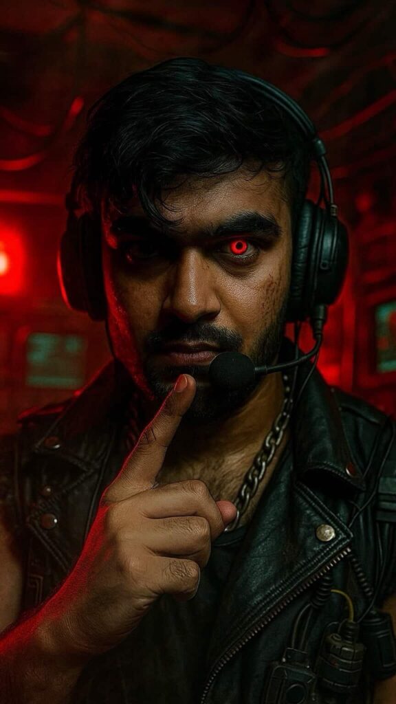 - LEATHER VEST, TORN SLEEVES, CHAINS, GADGETS STRAPPED. IN A CLUTTERED RADIO CONTROL ROOM WITH WIRES, RED EMERGENCY LIGHTS, AND BLINKING MONITORS. FIERCE EXPRESSION, FINGER ON MIC. DRAMATIC LIGHTING, MOODY SHADOWS, SMOKE HAZE, SHALLOW DEPTH, CINEMATIC.