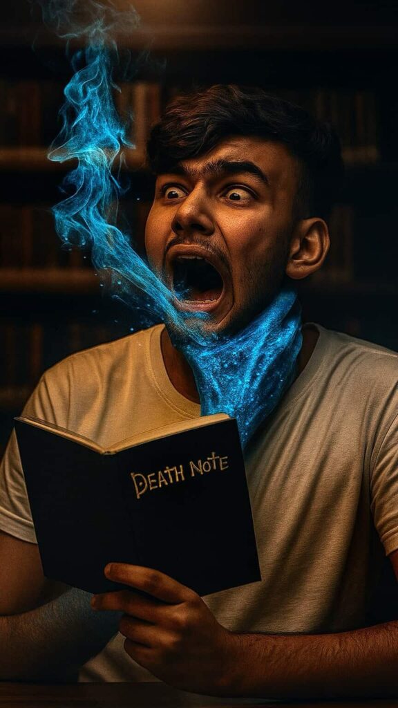 - A portrait photo of a young man wearing a plain white t-shirt, sitting and holding a “Death Note” book in a library, with a table in front of him. From the book, blue smoke emerges in the shape of a hand gripping the man’s neck. His expression shows fear, as if he is about to scream. The library atmosphere is slightly dark and dramatic, with overhead lighting subtly illuminating his face. The photo is taken from the front, with bookshelves in the background.