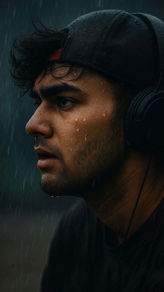 - Close-up portrait of a young 28 year old man(attached photo) in the rain, seen from profile, looking into the distance with a melancholic expression. he is wearing a dark baseball cap with a red detail and black over-ear headphones. His heavy dark hair is tousled by the coastal wind, falling leicht ins Gesicht, voller Textur und Bewegung.. Raindrops are clearly visible on his skin. The background is a heavily blurred, dark, rainy outdoor scene with visible streaks of falling rain