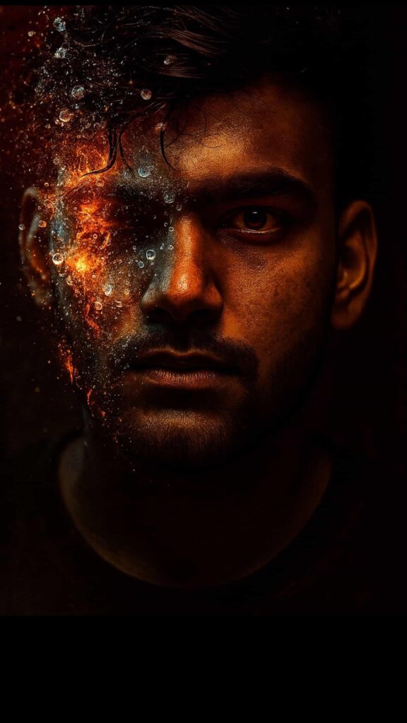 - Create a high-contrast close-up portrait of the referenced man. The image should depict only the left half of his face, partially submerged in water, with fire and ice droplets and bubbles visible on his skin and hair. Illuminate the left side of the face dramatically, casting the rest into deep shadow. dark background. detail in skin texture, beard stubble, and eye focus to evoke a moody cinematic atmosphere. 3:4 orientation. Make it warm color