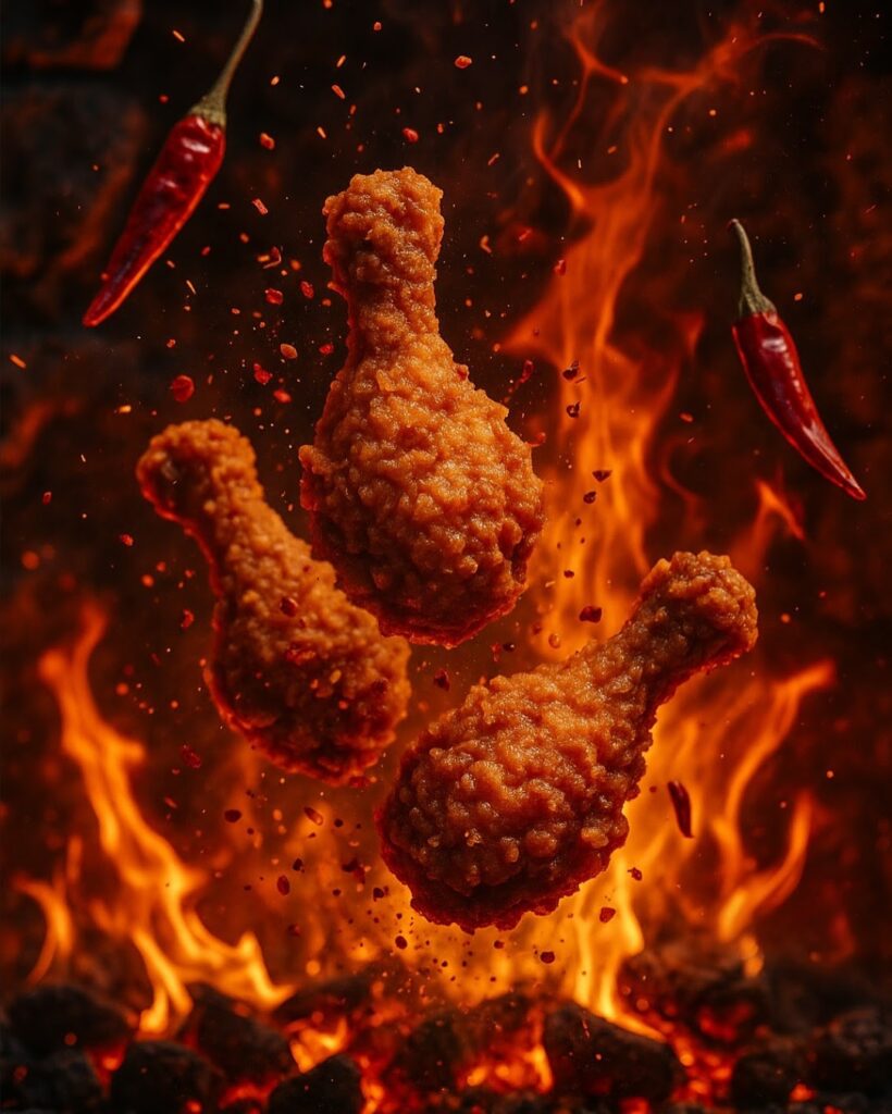 A high-speed, ultra-cinematic food action shot capturing golden crispy fried chicken drumsticks caught mid-air, surrounded by explosive bursts of chili flakes, whole red chilies, glowing embers, and fiery dust. The environment is intensely dramatic, with swirling flames and fine smoke rising in the background, creating the feel of a fiery kitchen battlefield. No sauce or broth present-only raw flames and dry heat intensifying the crunchy texture and spicy energy of the shot. The setting is a rugged, smoke-drenched kitchen with cracked stone walls and glowing embers scattered on the floor, evoking a volcanic cooking zone. No text or headlines are present. Captured with a Sony a7 IV and Sony FE 70mm f/2 GM lens - macro, HDR, high-speed freeze motion, hyper-detailed textures, warm cinematic lighting, and shallow depth of field. Format 1080px x 1350px
