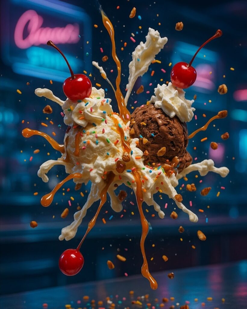 A high-velocity macro freeze-frame of an ice cream sundae exploding in mid-air: scoops of vanilla and chocolate flung apart, with slow-falling streams of caramel, whipped cream plumes, crushed pecans, rainbow sprinkles, and glazed cherries scattered in every direction. The backdrop is a neon-lit retro dessert parlor with glossy counters and flickering fluorescent reflections. No humans visible. Captured using Sony a7 IV and 70mm f/2 GM lens - hyper-real textures, shallow depth, cinematic cold lighting with HDR intensity, and sharp frozen motion. Format 1080px x 1350px.