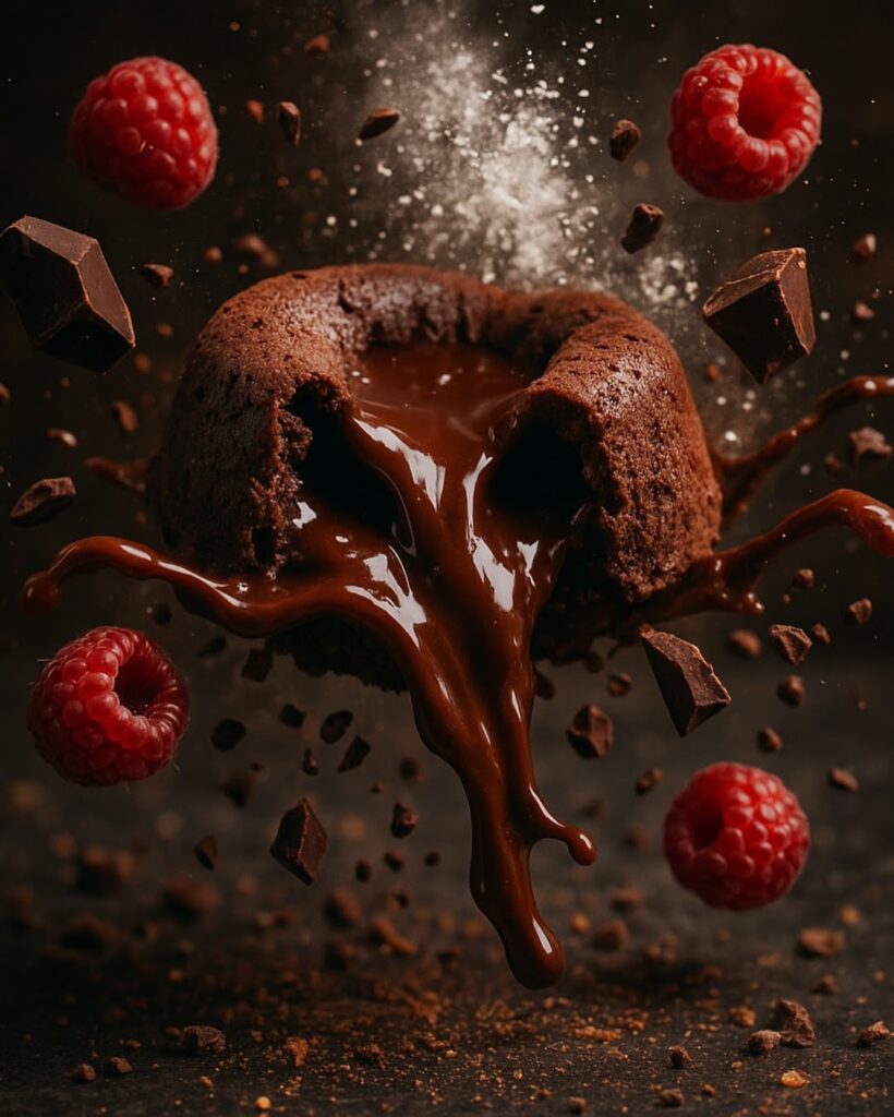 A slow-motion inspired, ultra-cinematic dessert scene showing a molten chocolate cake bursting open mid-air, sending thick ribbons of hot chocolate lava outward. Around it swirl chunks of dark chocolate, powdered sugar clouds, cocoa nibs, and flying raspberries. The background is moody and rich-a dark granite surface glowing with warm ambient light scattered with golden crumbs and vaporized sweetness. Shot with a Sony a7 IV and 70mm f/2 GM lens - high-speed clarity, hyper-detail, soft shallow focus, warm dramatic tones, and HDR quality. Format 1080px x 1350px.
