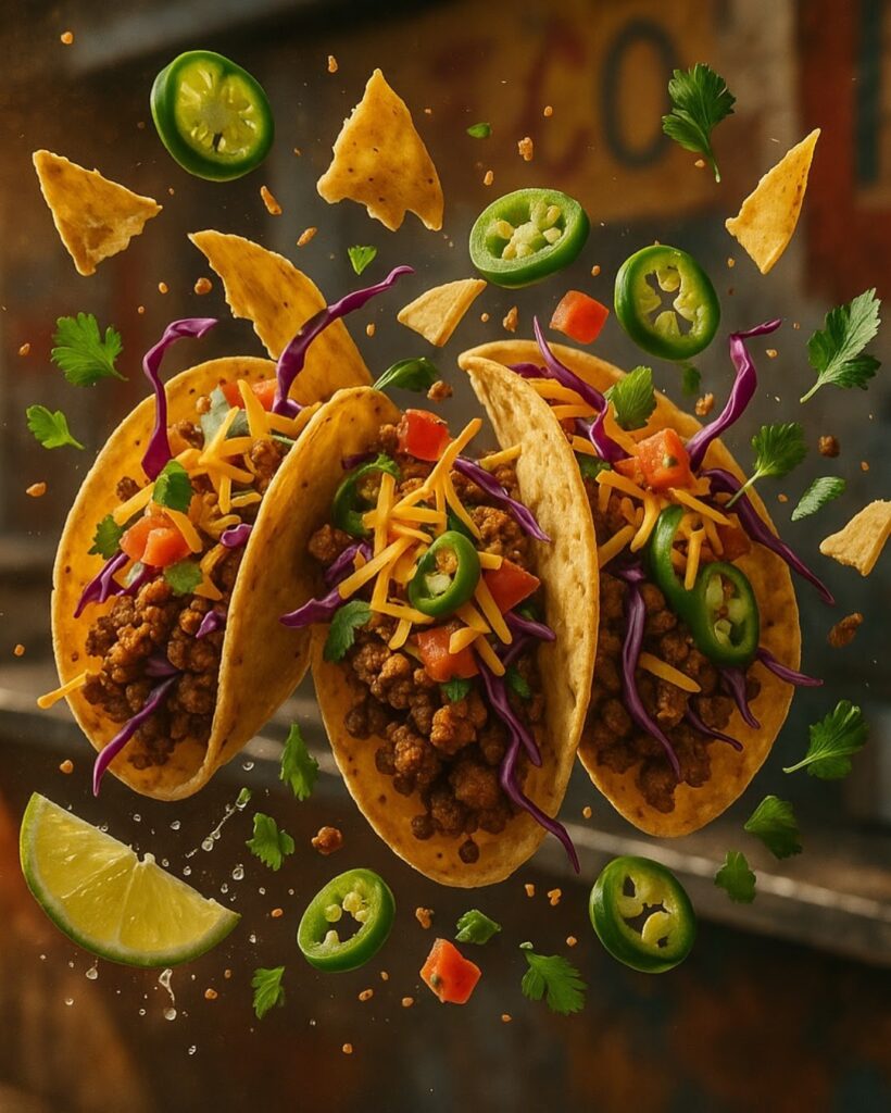 A dramatic, ultra-cinematic capture of tacos mid-toss, shells cracked in motion, ingredients like spiced ground beef, shredded cheese, purple cabbage, jalapeño slices, and pico de gallo caught in an upward spiral. Micro splashes of lime juice and scattered cilantro leaves add vibrant accents. The backdrop suggests a sun-drenched, gritty street taco stand with metallic counters and hand-painted walls, dusted in ambient flare. Shot on Sony a7 IV and Sony FE 70mm f/2 GM lens - freeze-frame detail, vibrant HDR tone, macro depth, warm midday glow, and intense texture realism. Format 1080px x 1350px