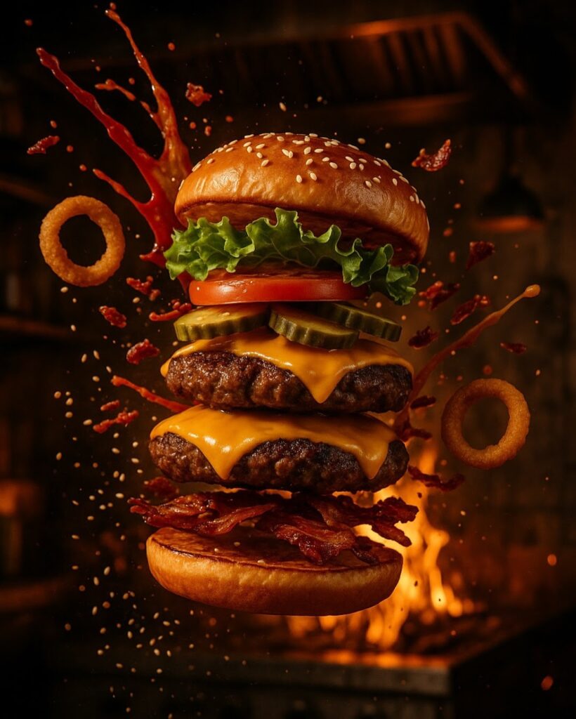 A high-speed, cinematic capture of a cheeseburger mid-build with layers of beef patties, melting cheddar, lettuce, tomato, pickles, and buns suspended in air. Exploding behind it are splashes of ketchup and mustard, flying onion rings, sesame seeds, and sizzling bacon fragments. The background is set in a flame-lit industrial diner kitchen with grungy walls and ambient ember sparks, evoking a fierce food showdown. No people in frame. Shot on a Sony a7 IV with a 70mm f/2 GM lens - macro-level sharpness, freeze-frame motion, dramatic warm lighting, shallow focus, and intense textural clarity. Format 1080px x 1350px.