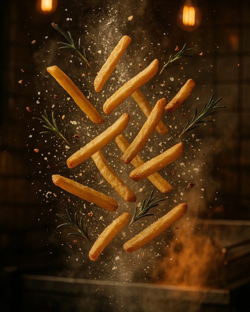 Interspersed are crispy rosemary sprigs and parmesan dust, suspended as if in a flavor storm. The backdrop is a moody industrial fryer station with glowing filament bulbs, greasy tiles, and rising heat haze. No humans or branding. Captured with a Sony a7 IV and Sony FE 70mm f/2 GM lens - macro-level texture, freeze-frame motion, cinematic amber lighting, shallow focus, and ultra-HD crispness. Format 1080px x 1350px